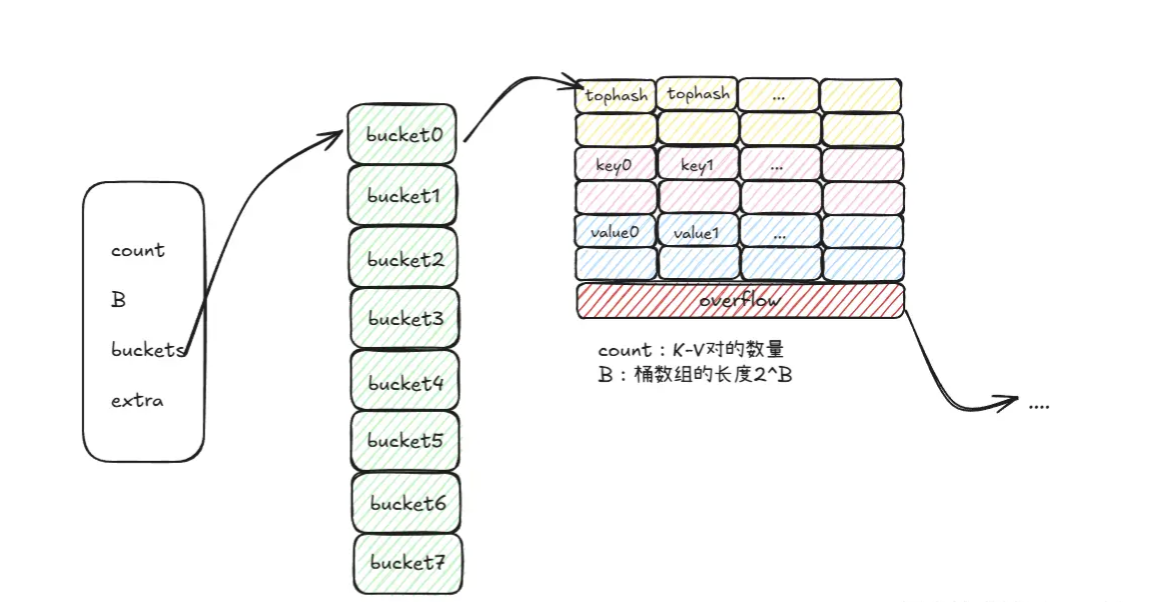 - bmap 就是 map 中桶的具体数据结构,是上图中 bucket0 指向的内存块,一个桶可以存储8组 key-value 对,以及一个指向下一个 bmap的指针;