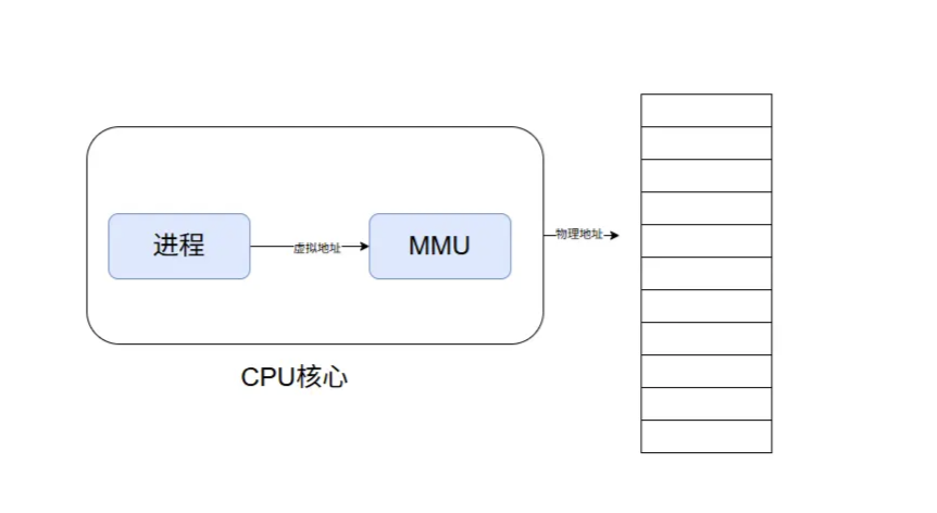 进程持有的虚拟内存地址会通过CPU中的MMU的映射关系然后转变成物理地址,然后再通过物理地址访问内存: