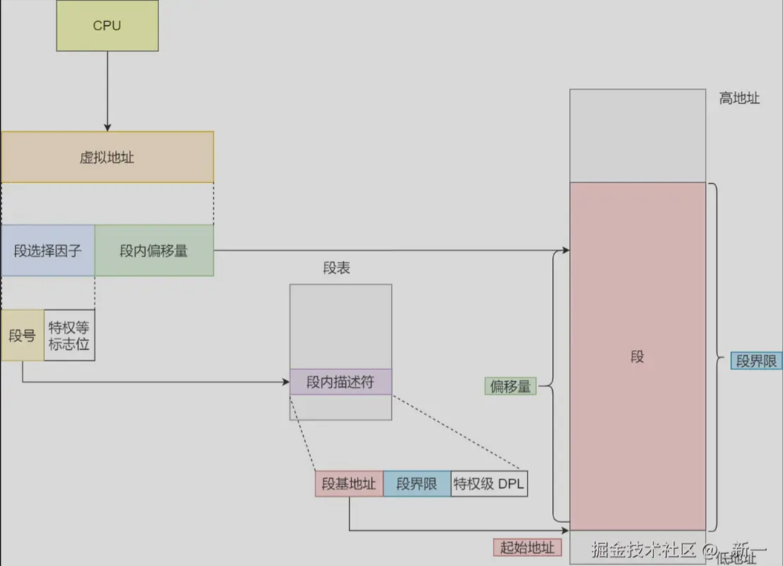 段内偏移量:偏移量每个段都是唯一的,位于0到段界限之间,映射公式:段基地址+段内偏移量=物理内存地址